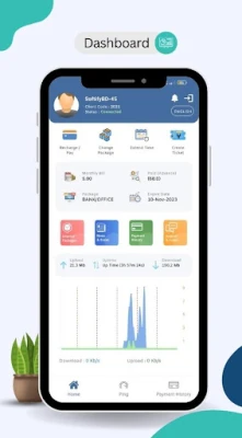 Hold styr på økonomien din og sørg for uavbrutt tilkobling. Betal din månedlige regning trygt og gebyrfritt via den integrerte bKash betalingsløsningen. Du får også full oversikt over din betalingshistorikk. Selv om internettilkoblingen din skulle være brutt grunnet ubetalt regning, er du ikke uten muligheter. Bruk mobildata eller en annen tilgjengelig internettforbindelse for å betale regningen i appen, og tjenesten din vil bli automatisk reaktivert. Ved totale brudd kan du fortsatt opprette en supportbillett via mobildata, slik at vårt supportteam umiddelbart kan adressere problemet. Få dessuten varsler om viktige nyheter, tilbud eller eventuelle driftsforstyrrelser direkte i appen, slik at du alltid er oppdatert.