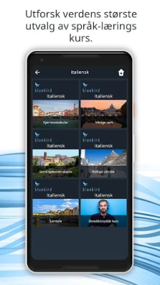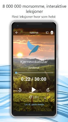 Kvalitet står i høysetet hos Bluebird. Vårt pensum er omhyggelig utformet av erfarne lærere og oversatt av mennesker, mens profesjonelle morsmålsstemmer skaper lydopptak i studiokvalitet. Dette sikrer en autentisk og engasjerende læringsopplevelse som er både berikende og pålitelig. Hver leksjon varer mellom 15 og 45 minutter, og tilbyr et gjennomsnitt på 10 000 instruksjonelle fraser per språk – uten sidestykke i omfang. Enten målet ditt er reise, karriere, skolegang, eller bare gleden ved å lære noe nytt, leverer Bluebird en familievennlig plattform som ikke bare underviser, men også forankrer kunnskapen for livet. Du kan til og med strømme dine Bluebird-leksjoner direkte til smarthøyttalere som Google Home eller din TV, og gjøre språklæring til en integrert del av ditt digitale hjem.