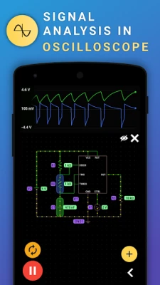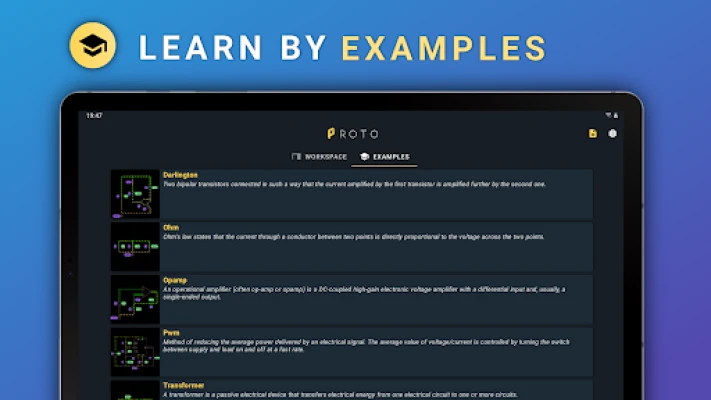 Med PROTO blir kretsanalyse en visuell og interaktiv opplevelse. Se strømflyt og spenningsverdier animert direkte på skjermen, juster parameterne i sanntid for å se effekten umiddelbart, og analyser detaljerte signaler med et responsivt firekanals-oscilloskop. Den intuitive avspillings-/pauseknappen gir deg full kontroll over simuleringen, mens funksjoner for kopiering av komponenter og deling av kretser med venner forenkler arbeidsflyten. Utvid din kunnskap med innebygde eksempler og videoopplæringer, og tilpass ditt arbeidsmiljø med ulike temaer som mørk, lys, hav eller solarisert. Eksporter enkelt dine kretser og arbeidsområder som PNG, JPG, PDF for dokumentasjon eller presentasjon.